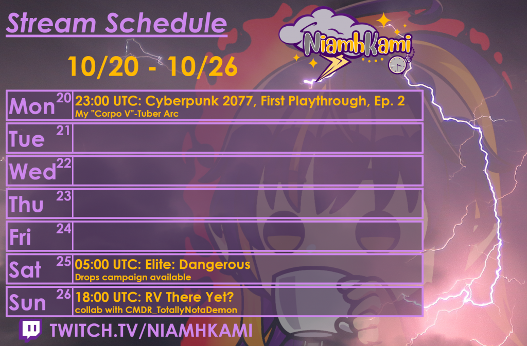 21:00 UTC 11/10 – RV There Yet (collab with CMDR_TotallyNotADemon) → Cyberpunk 2077, First Playthrough, Ep. 5
